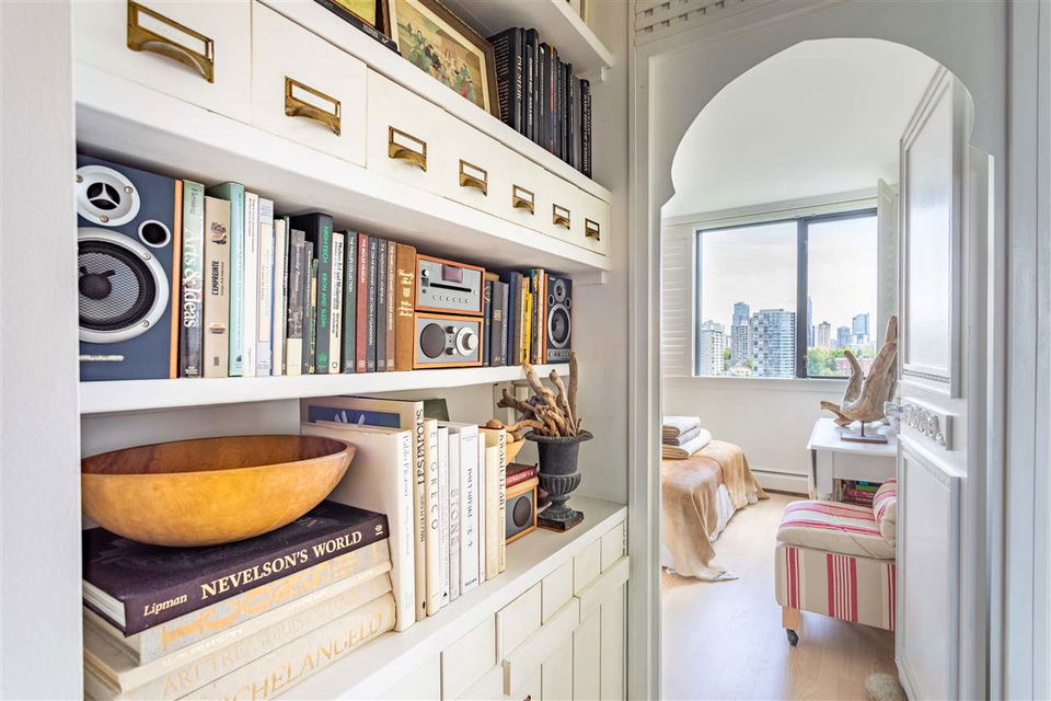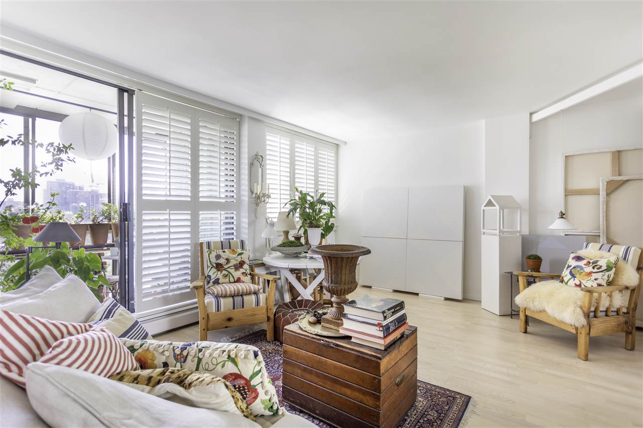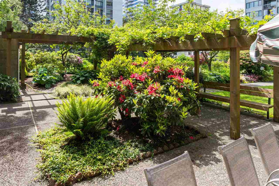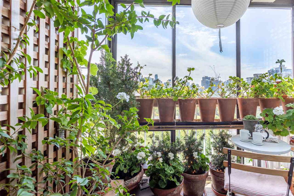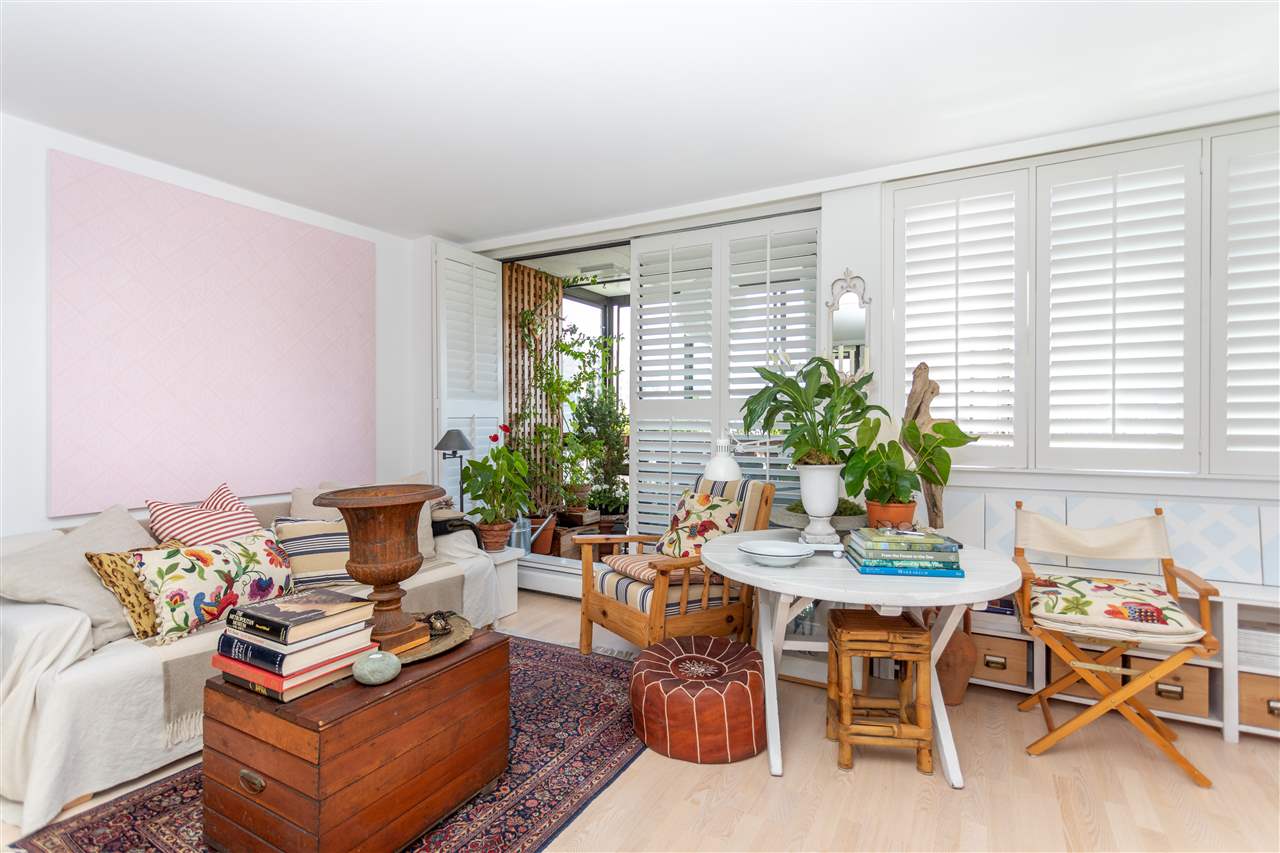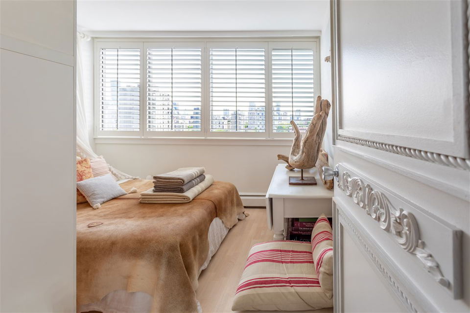 This artistic retreat combines a garden filled solarium with French country inspiration creating a private 1 bedroom in the desirable West End! European ash hardwood floors blended with Italian ceramic tiles. California wood shutters casing the windows & patio sliders. Uniquely designed & maximizing every inch of space. Bright & airy with floor to ceiling mirrored walls. Eastern views of the City, mountains & the strata’s gorgeous secluded garden. An abundance of well designed storage. Investment or full-time home, this is about location! English Bay & Stanley Park just a stroll away. The Sandpiper is a well maintained concrete residence with a full-time manager on site & pets are welcome. All set on a quiet tree-lined street with the City’s bike lane right outside your door!