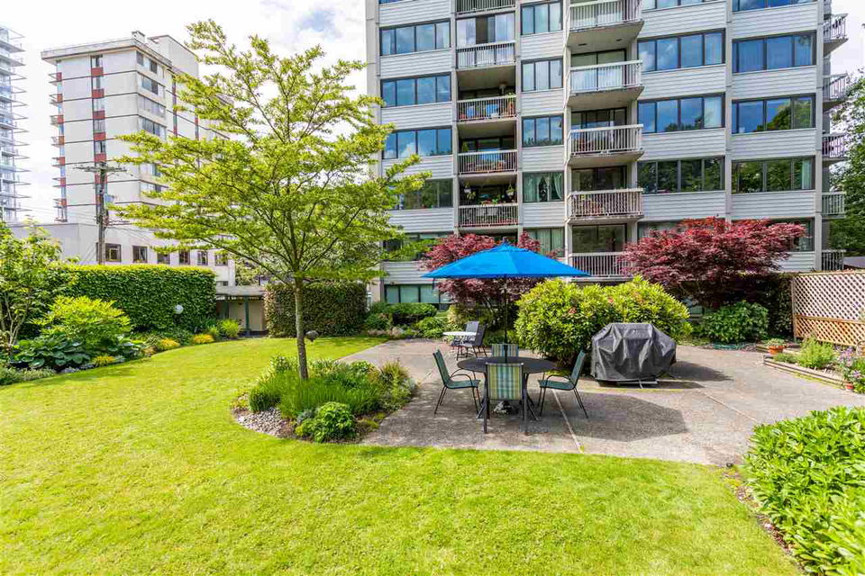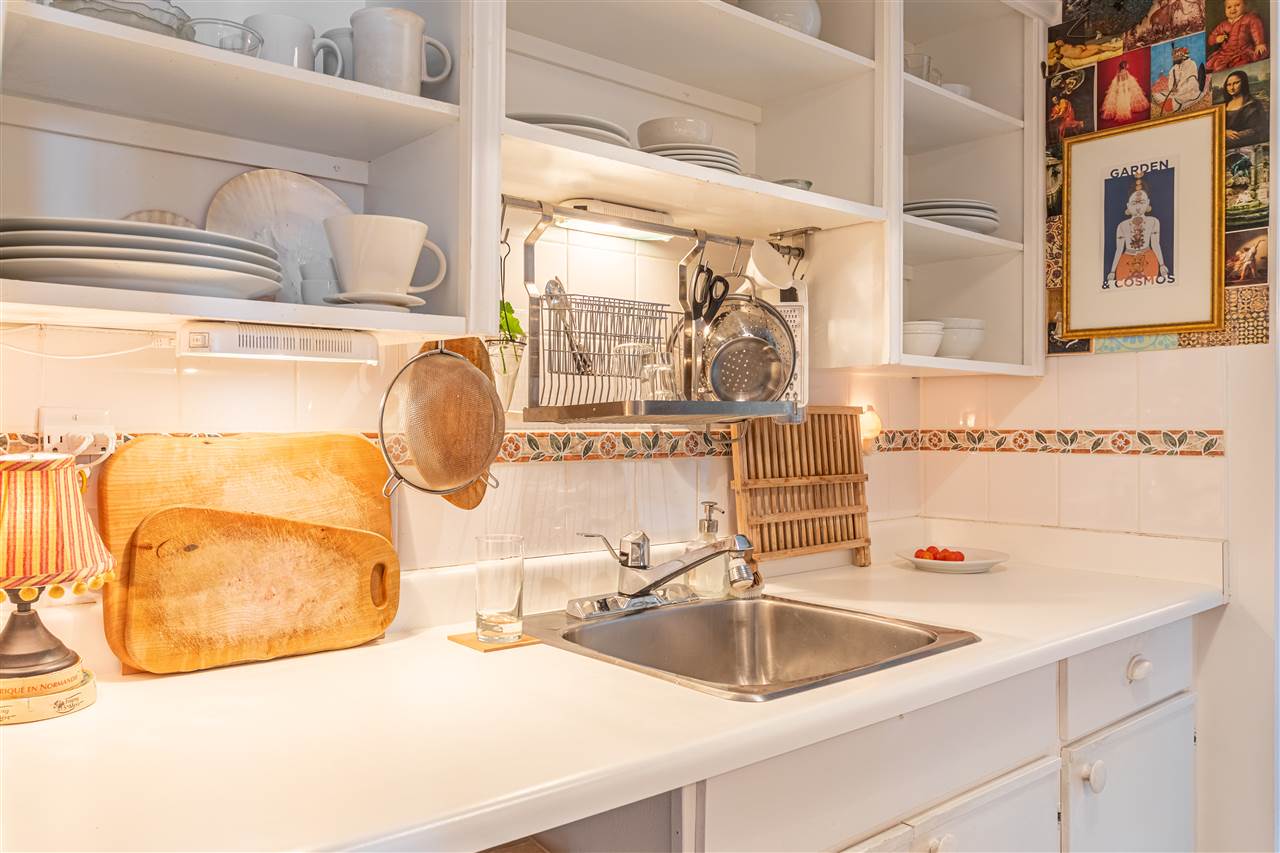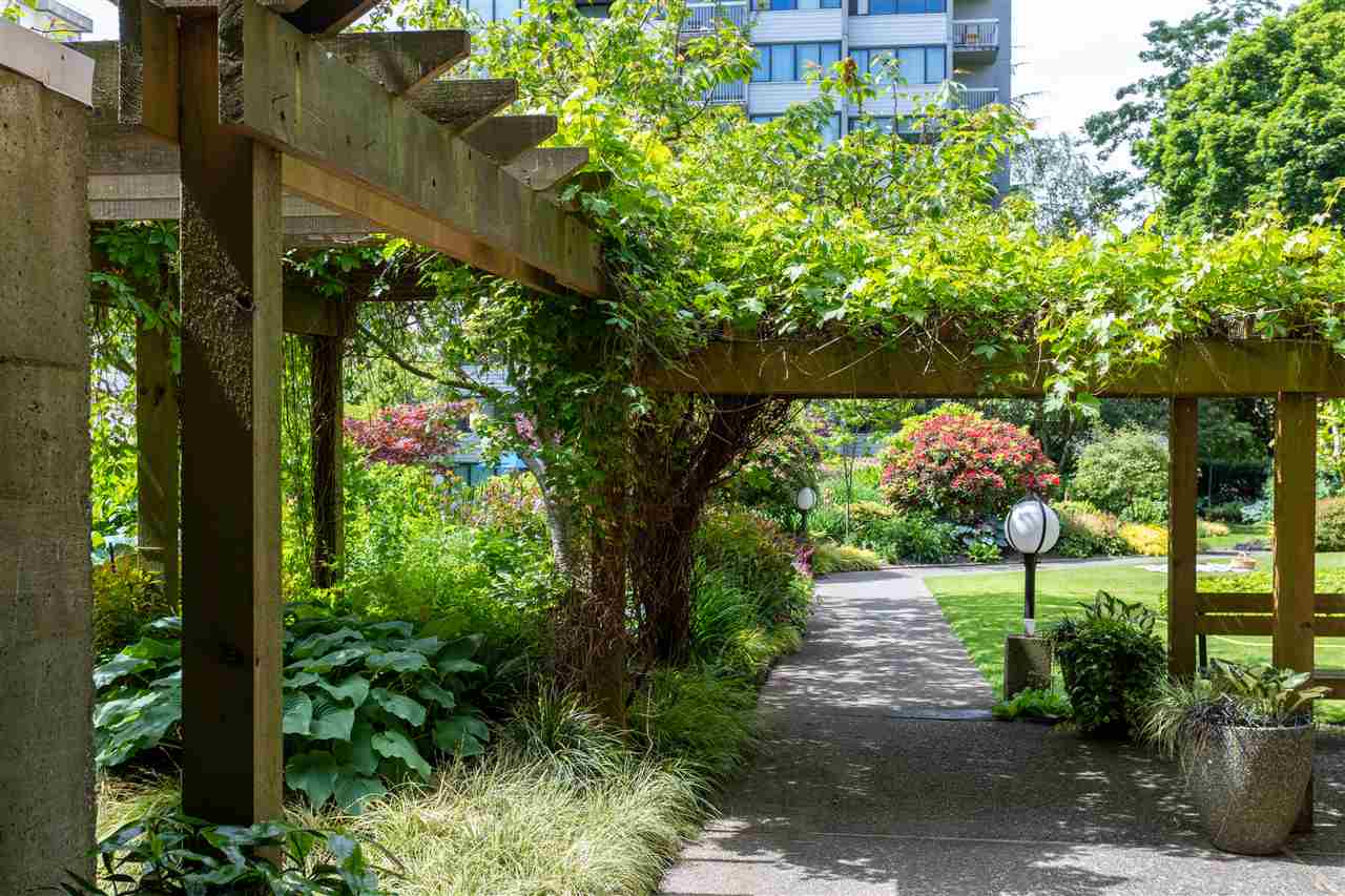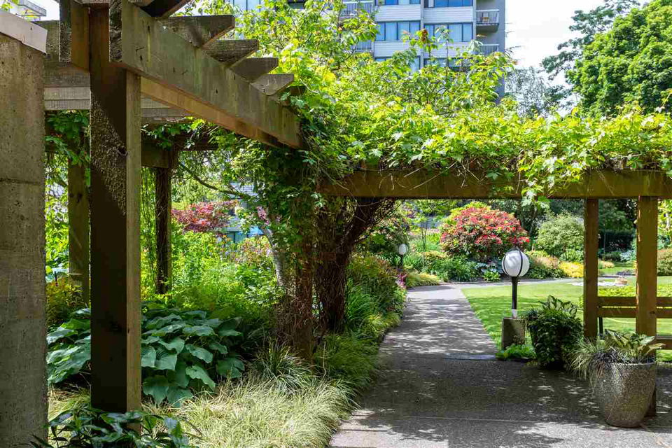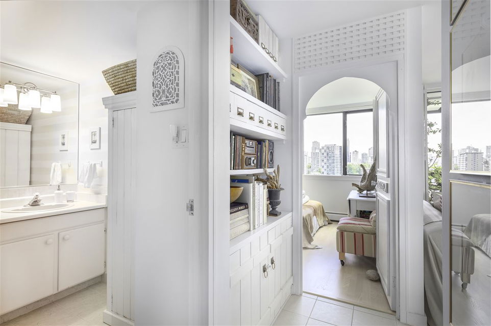 This artistic retreat combines a garden filled solarium with French country inspiration creating a private 1 bedroom in the desirable West End! European ash hardwood floors blended with Italian ceramic tiles. California wood shutters casing the windows & patio sliders. Uniquely designed & maximizing every inch of space. Bright & airy with floor to ceiling mirrored walls. Eastern views of the City, mountains & the strata’s gorgeous secluded garden. An abundance of well designed storage. Investment or full-time home, this is about location! English Bay & Stanley Park just a stroll away. The Sandpiper is a well maintained concrete residence with a full-time manager on site & pets are welcome. All set on a quiet tree-lined street with the City’s bike lane right outside your door!