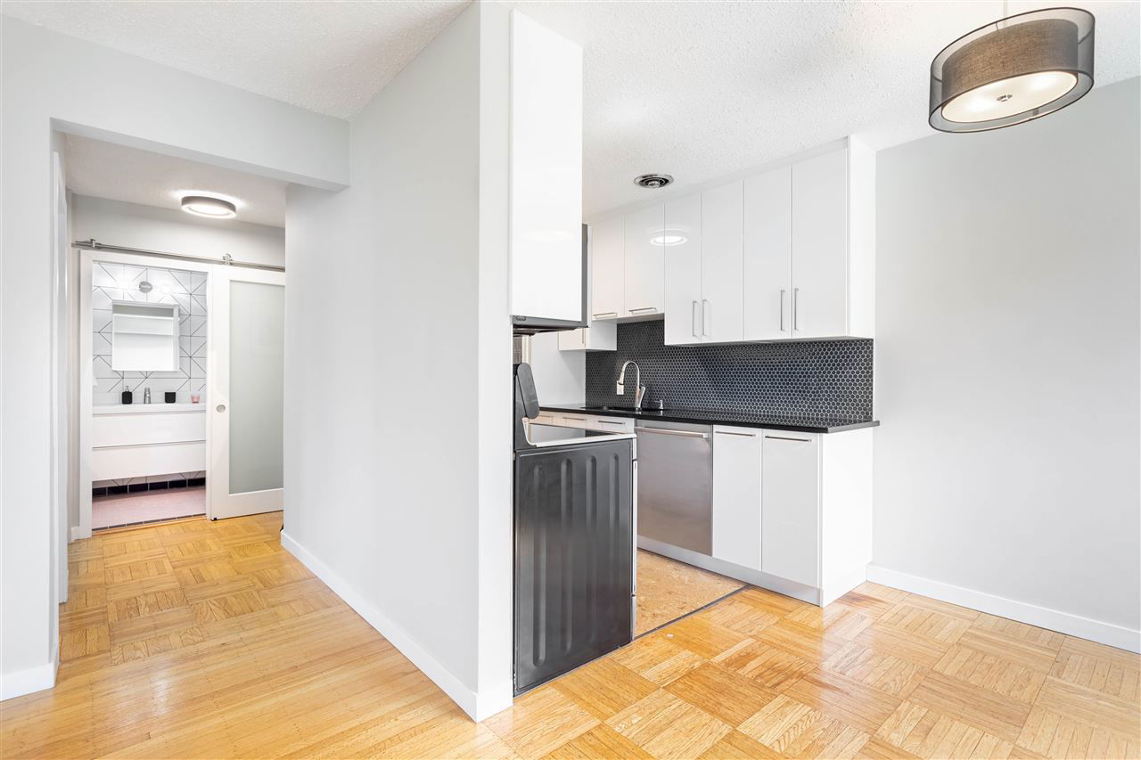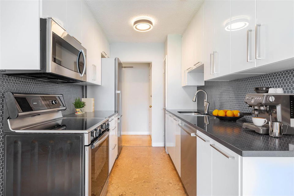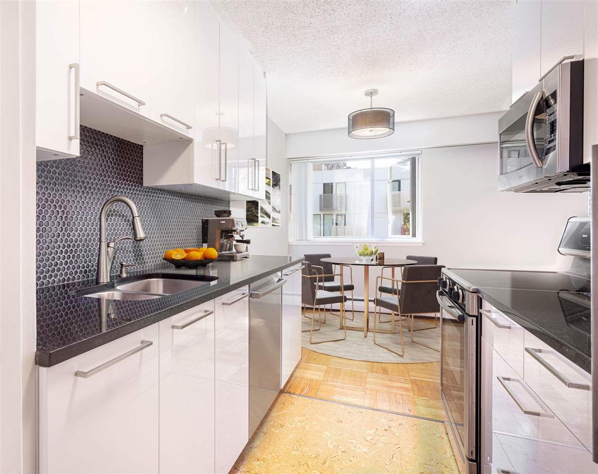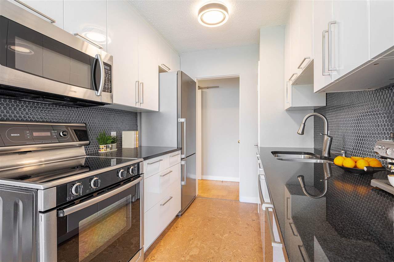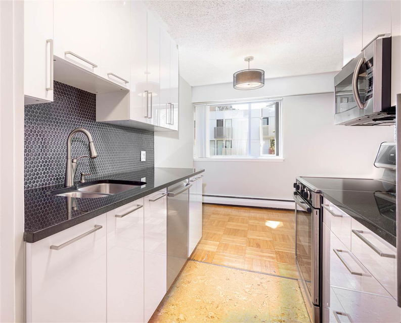 It’s 1950’s character with contemporary modern! Much of what is on your purchase list is right here. Loads of light, south west facing and very spacious. Gorgeous oak hardwood floors blended with Art Deco modernist character. Visualize enjoying a fresh oversized 1 bedroom corner home with updated elements. Polished kitchen cabinetry, granite counters with a high quality stainless package and honey cork floors. A living room big enough for house size furniture and dining area for comfortable and enjoyable entertaining, for your small bubble. The bedroom will fit a king. A stylish bath with mosaic retro floor tile. All overlooking tree lined Comox and Jervis. This location is a walkers paradise, has a transit score of 99 and the City bike route right outside your door. Add heat, hot water, storage and secure parking to the list of inclusions. Pets are welcome. A desirable fully upgraded strata Jervis Manor is located in the heart of the West End near Nelson Park, Barclay Heritage Square and Sunset Beach Park.