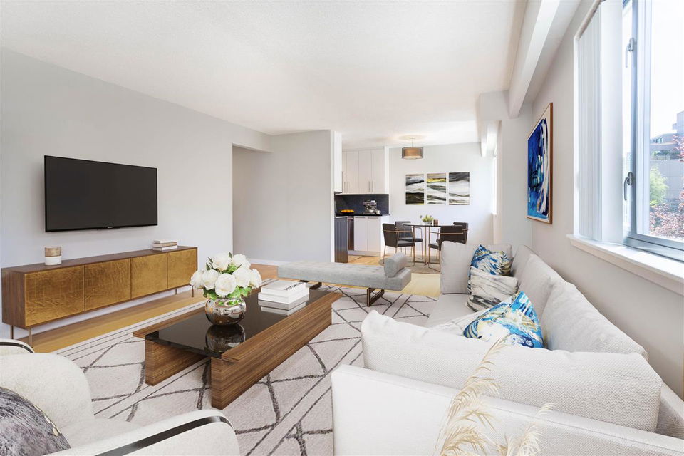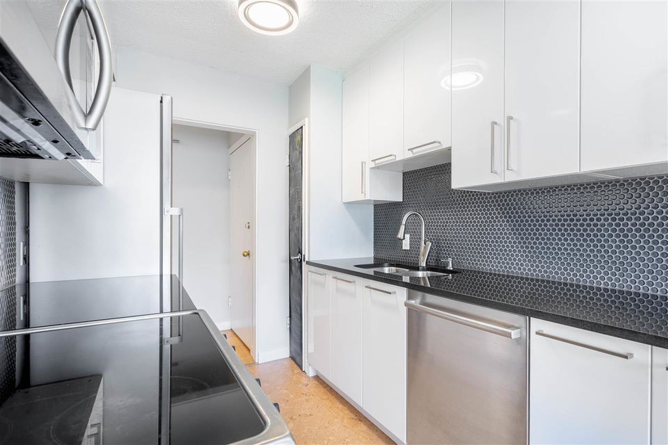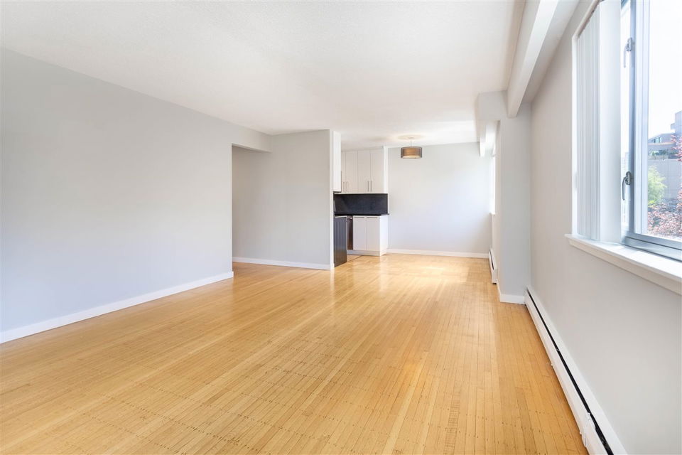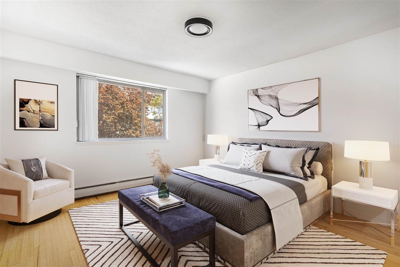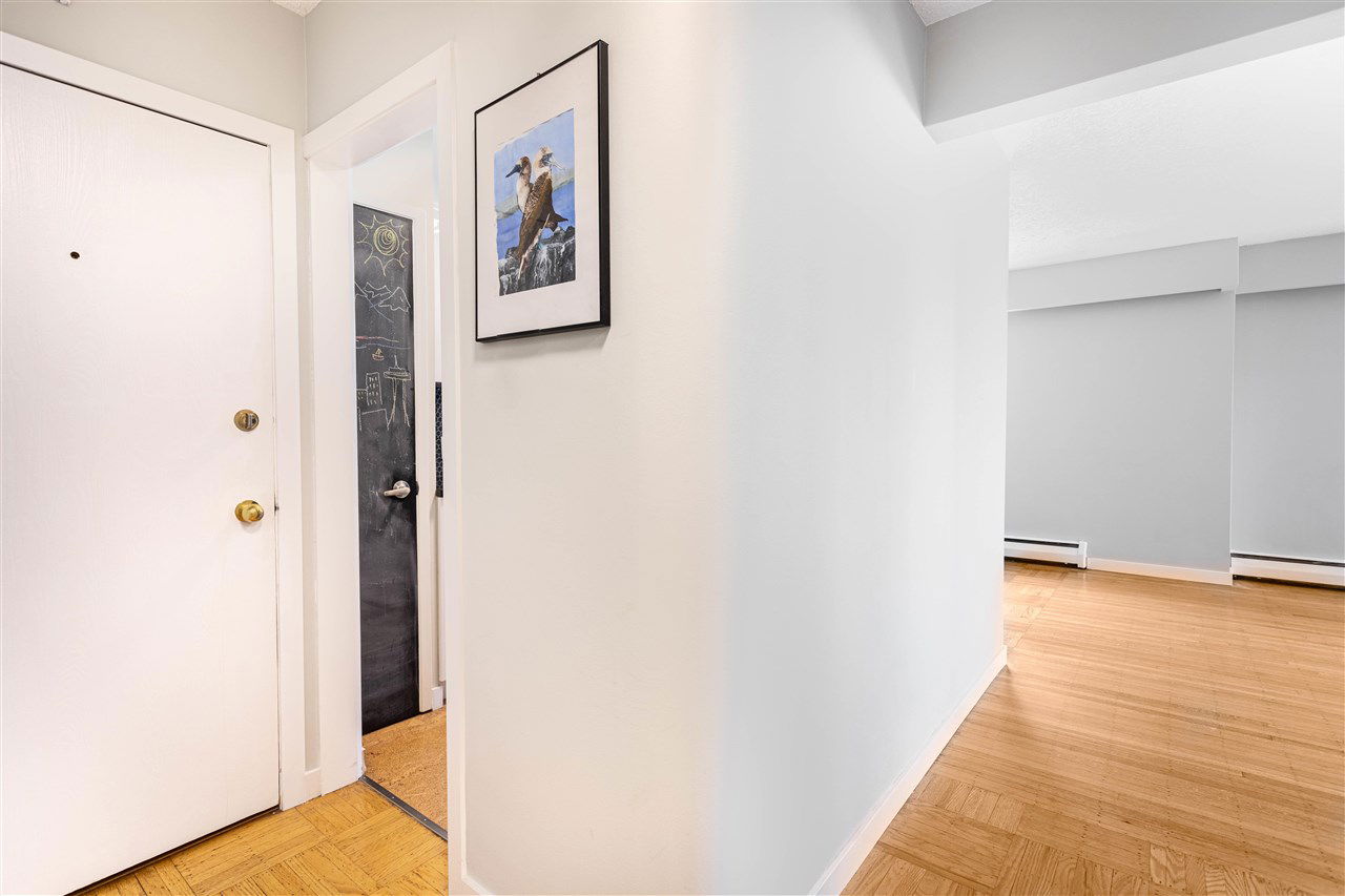 It’s 1950’s character with contemporary modern! Much of what is on your purchase list is right here. Loads of light, south west facing and very spacious. Gorgeous oak hardwood floors blended with Art Deco modernist character. Visualize enjoying a fresh oversized 1 bedroom corner home with updated elements. Polished kitchen cabinetry, granite counters with a high quality stainless package and honey cork floors. A living room big enough for house size furniture and dining area for comfortable and enjoyable entertaining, for your small bubble. The bedroom will fit a king. A stylish bath with mosaic retro floor tile. All overlooking tree lined Comox and Jervis. This location is a walkers paradise, has a transit score of 99 and the City bike route right outside your door. Add heat, hot water, storage and secure parking to the list of inclusions. Pets are welcome. A desirable fully upgraded strata Jervis Manor is located in the heart of the West End near Nelson Park, Barclay Heritage Square and Sunset Beach Park.