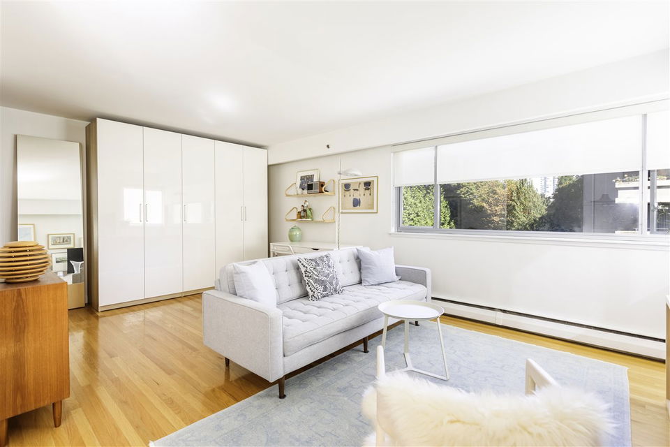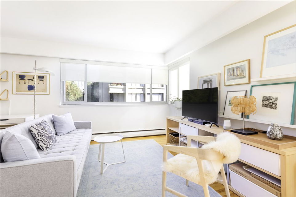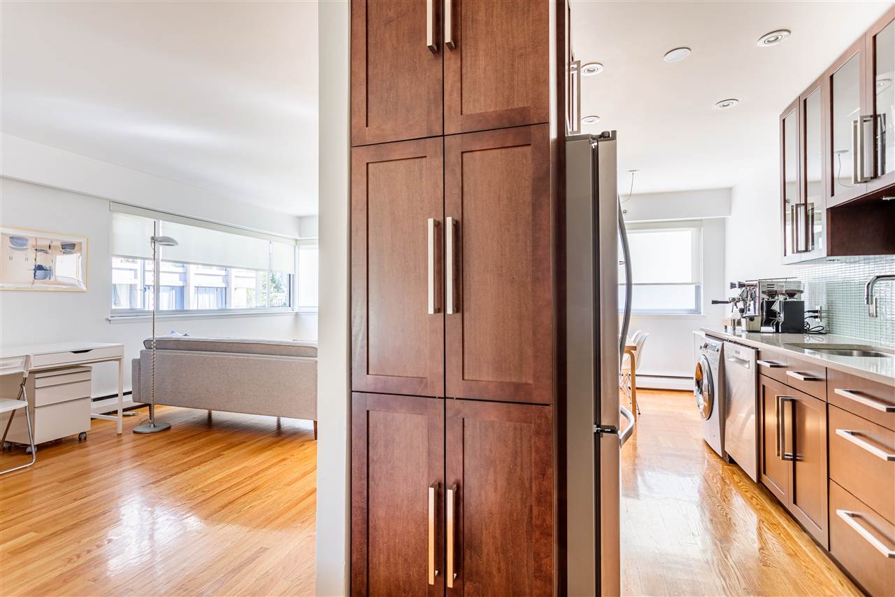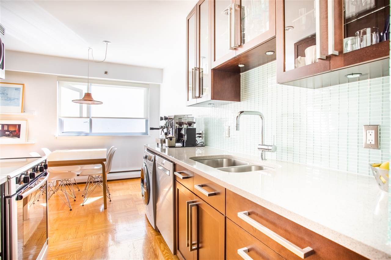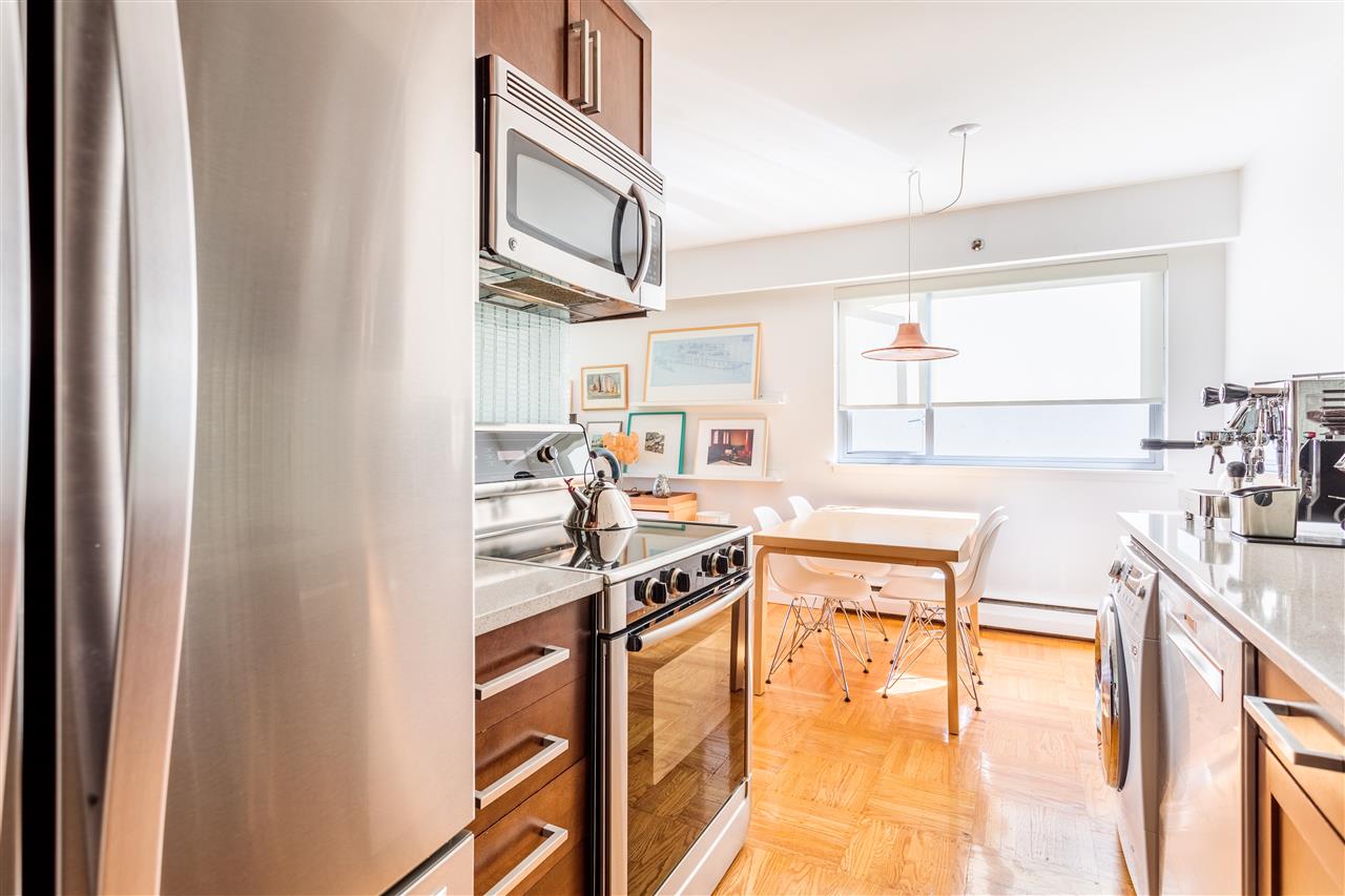 Impeccable, pristine, immaculate easily describe this picture perfect property! Top floor, north east 1 bedroom with an abundance of light streaming through windows on all sides of this 652 sq.ft corner suite. This fully renovated home is designed to accentuate it’s modernist style and appointed with tasteful contemporary features. Gleaming oak hardwood floors, stainless kitchen, Kitchencraft solid maple cabinets, quartz counters with sleek glass tiles. You will love the gorgeous sparkling luxury white bathroom with oversized polished tiling and deep soaker tub to soothe away the pressures of the day. Add to all of this perfection is storage, insuite laundry, locker and parking. Positioned in the heart of the West End, Jervis Manor is a boutique 50’s character retro building with deco features. A desirable worry free strata with updated central heating boilers, thermal windows and roof. Two blocks south to Davie St. and three blocks north to Robson St. is ideal convenience. Walk score is 94!