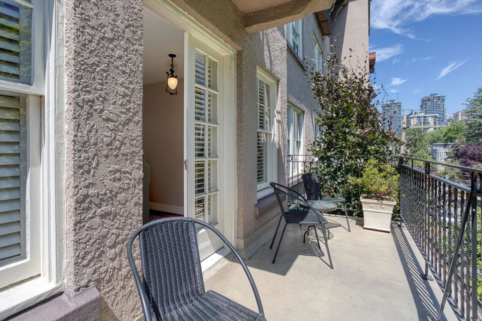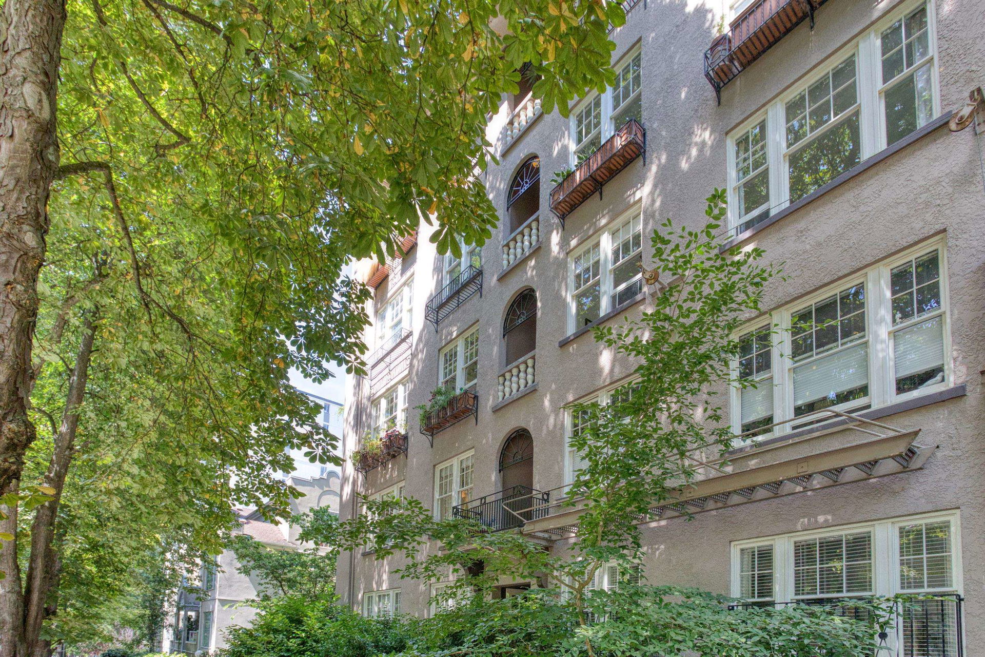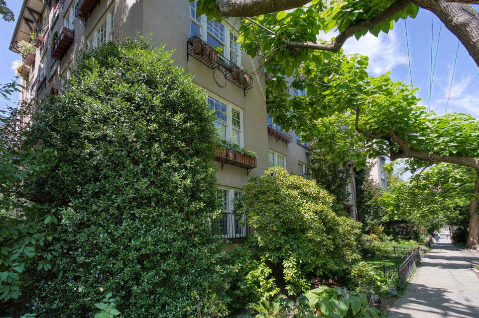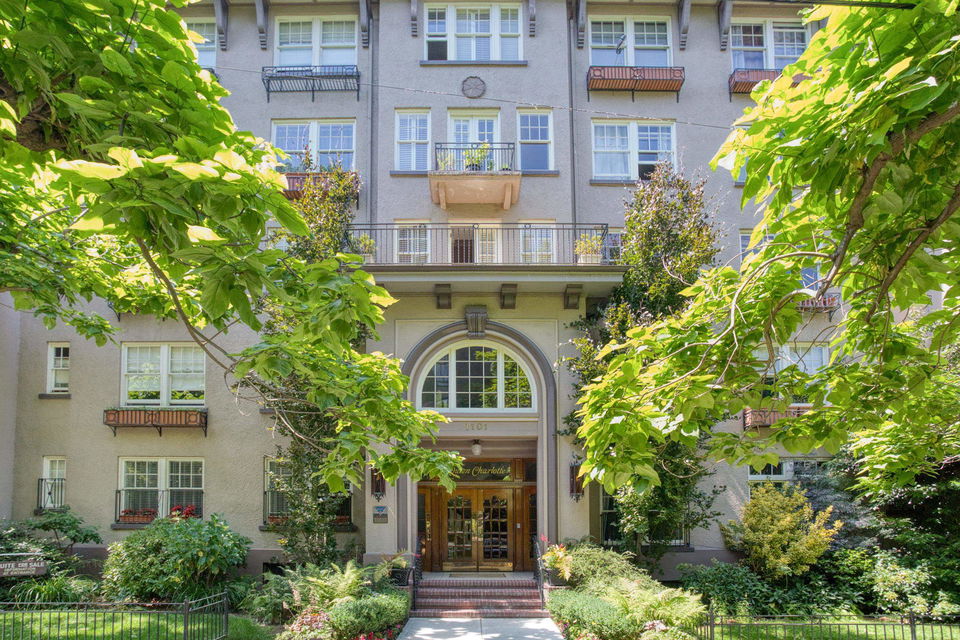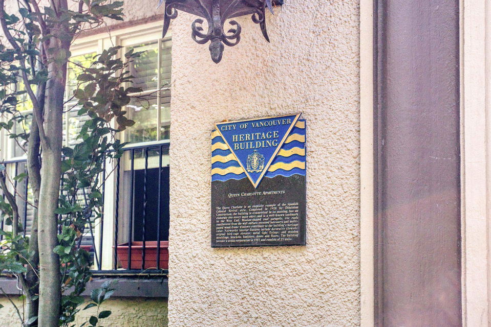 An opportunity to own a home of unique Heritage distinction. Nestled in the foliage of catalpa and chestnut trees, this stylish two bedroom home at the historic “Queen Charlotte” presents subtle richness and sophistication. An elegant corner residence, impressive sized rooms, no shared walls, classic moldings, French doors, 9 ft ceilings and inlay oak hardwood floors – all blending seamlessly with contemporary updates. This airy property is poised on the 3rd floor, with southeast exposure, tons of light, large casement windows, updated kitchen and appliances. Gorgeous architectural finishes, with floor to ceiling bookshelves in the bedroom/office and a walk-in closet in the primary bedroom. Solid reinforced concrete construction. Lovingly cared for, with a common terrace where neighbours can enjoy a coffee or glass of wine. English Bay a 5-minute walk away. This West End landmark is a property you’ll love to call home! Viewings by appointment.