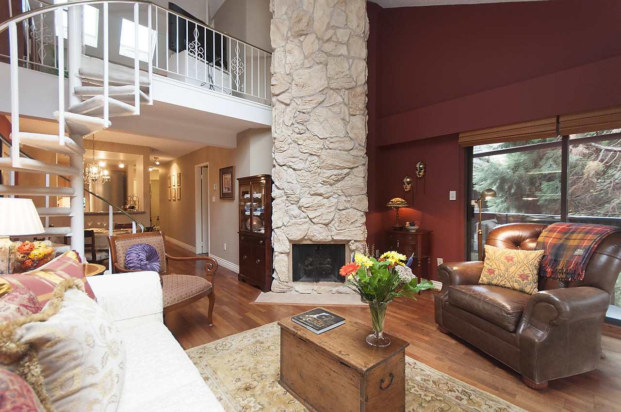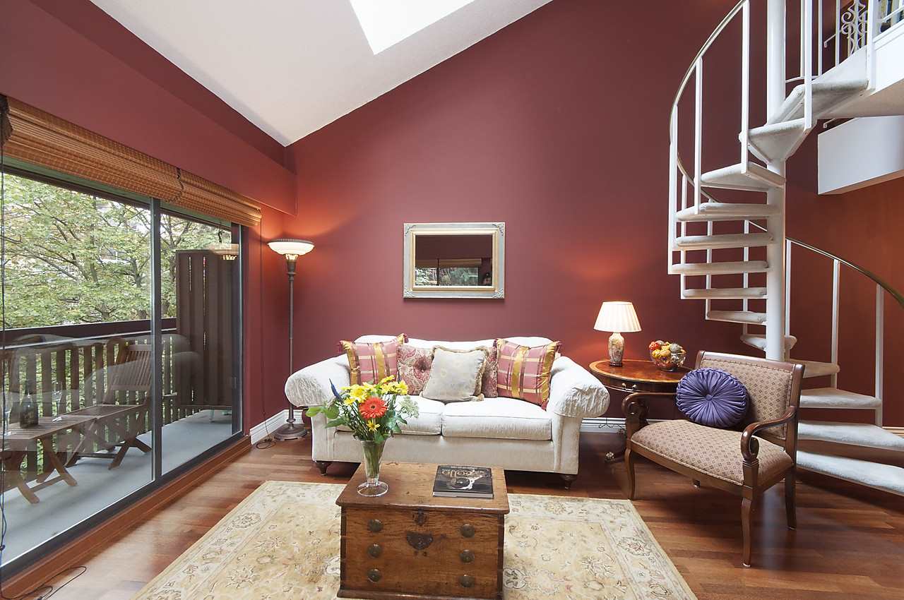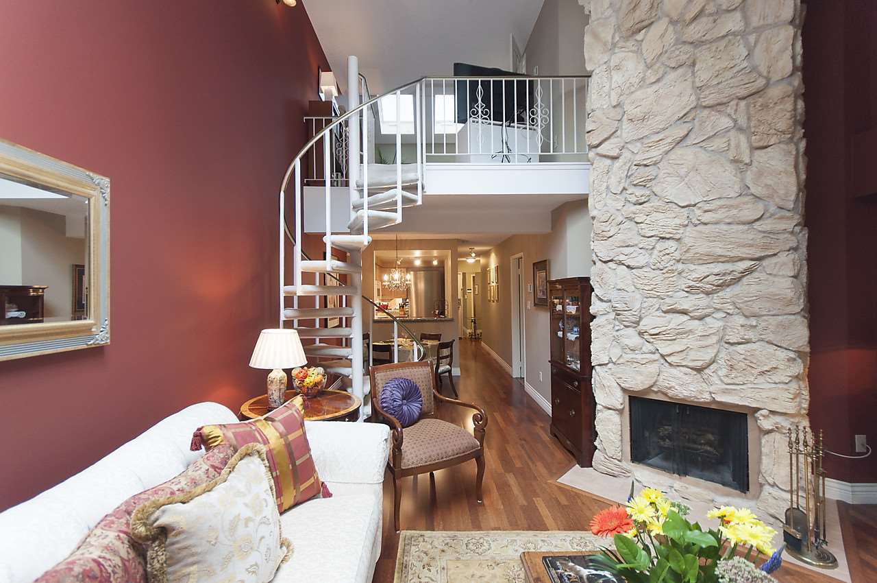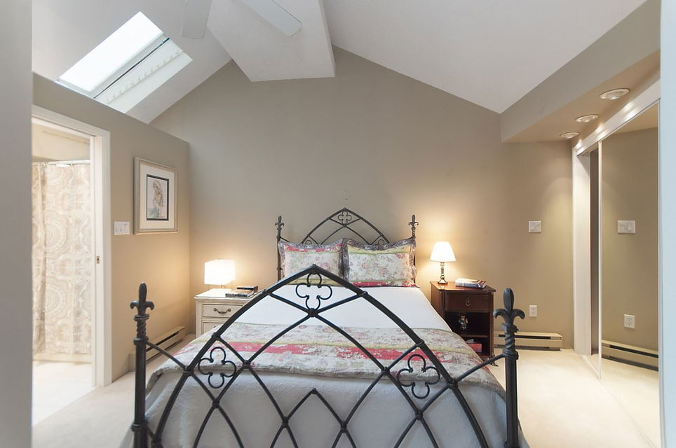 Fabulous & rare top floor, 2 level, 3 BEDROOM & family room/den & 2 full baths corner suite (1260 sqft). Main offers Brazilian Cherry hardwood flrs throughout, F–C stone wood burning fireplace, vaulted double height ceilings in LR, updated kitchen with new Miele Fridge & Dishwasher, 2 bedrooms & full bath, laundry/storage room with new Meile W&D & hotwater tank. Up is a good size cozy family room, Master bedroom and full ensuite, WI closet, bonus 200 sq.ft of storage space. Lots of windows & skylights offering natural light all year round & yet very private tucked in between the trees. Excellent building with a very proactive council & lots of recent updates. Super West End location, quiet tree lined street with easy access to shops on Robson St and Davie St., transit, great restaurants.