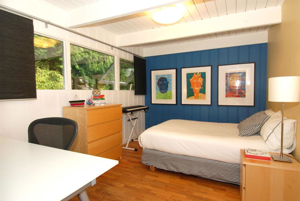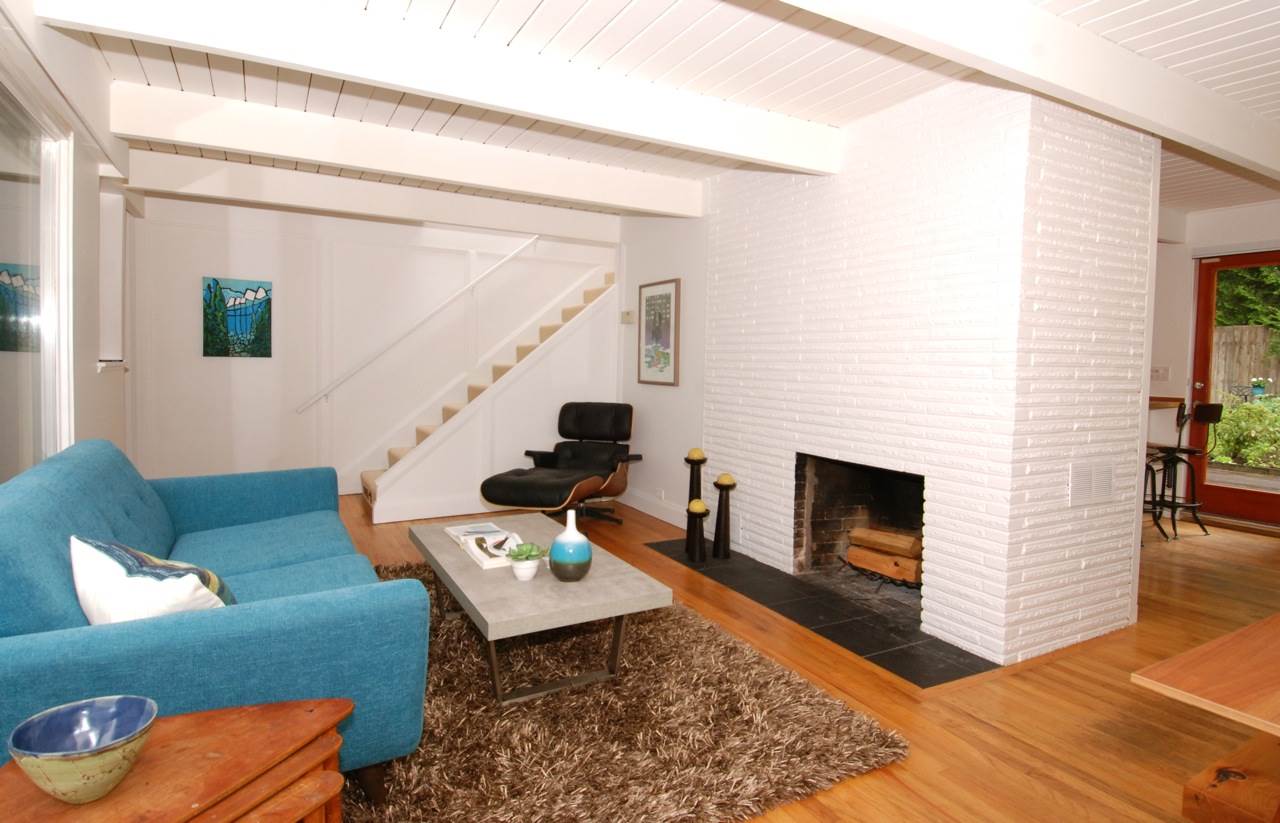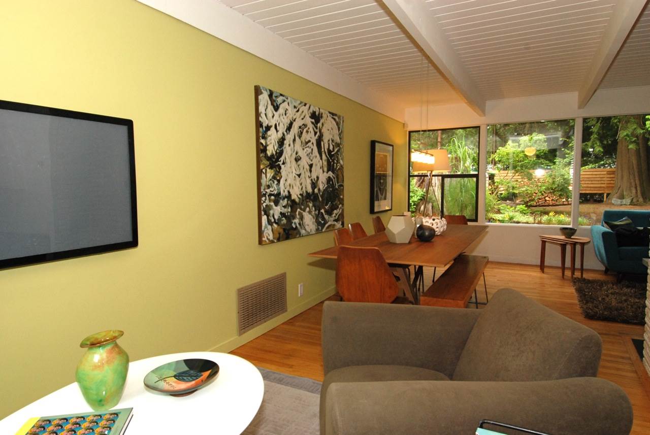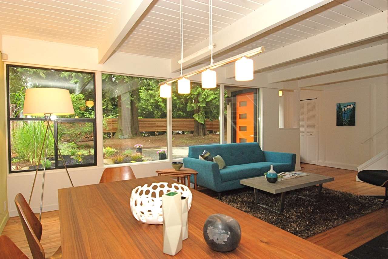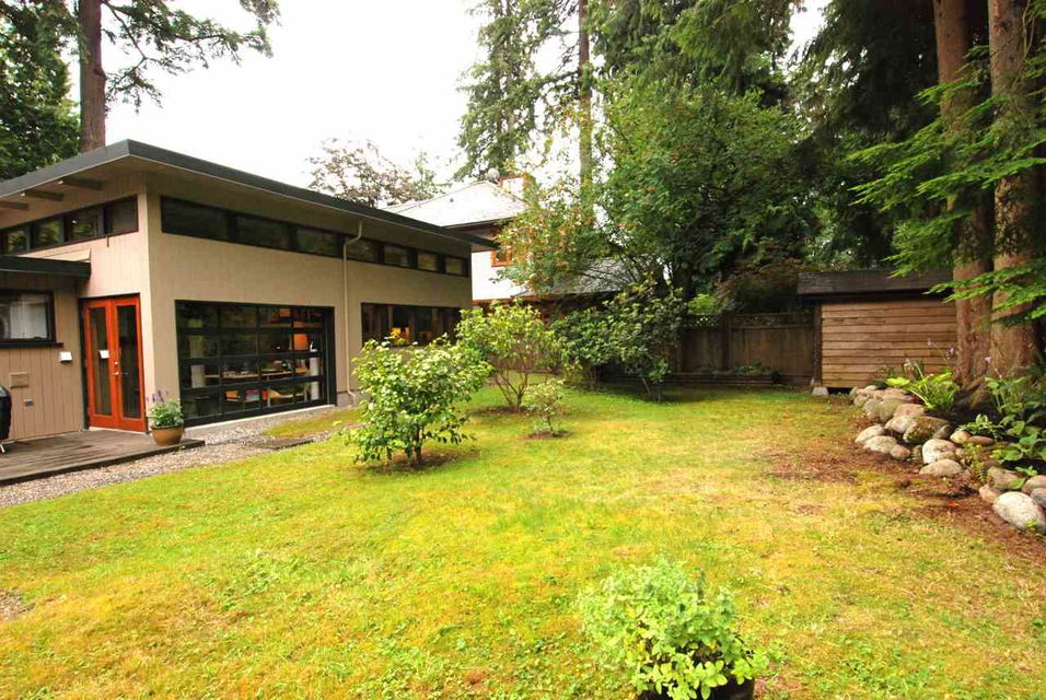 Nestled on a flat, 10,560 sq ft lot among huge cedars and Douglas Fir, this classic mid-century modern post and beam home offers oversized windows and skylights that bring the outdoors into every room. Living room has a wood-burning fireplace; open, entertaining-friendly kitchen/dining area has kitchen bar, Bosch gas stove, stainless appliances. 3 beds up and 1 on main floor. The unique, finished, insulated studio offers 900 sq ft column-free space with 12-foot ceilings, clerestory windows and polished concrete floor – a rec room for the imagination. Large outdoor wooden deck and extensive planted veg and flower garden. Moments to Capilano Canyon trails. Walk to Cleveland, Handsworth, Edgemont Village. 5 min drive to Grouse.
