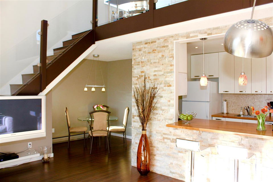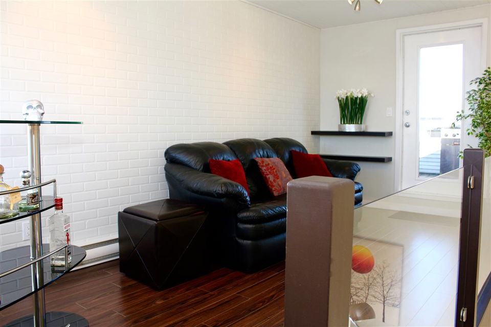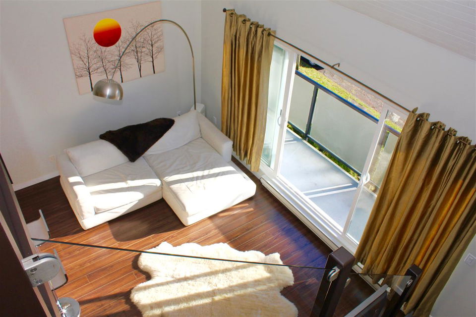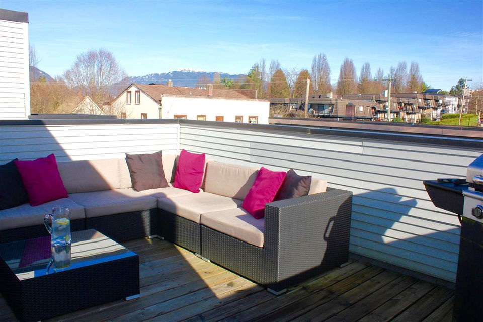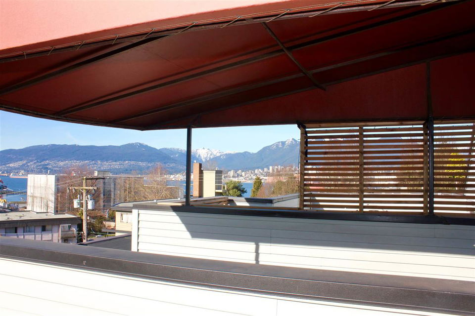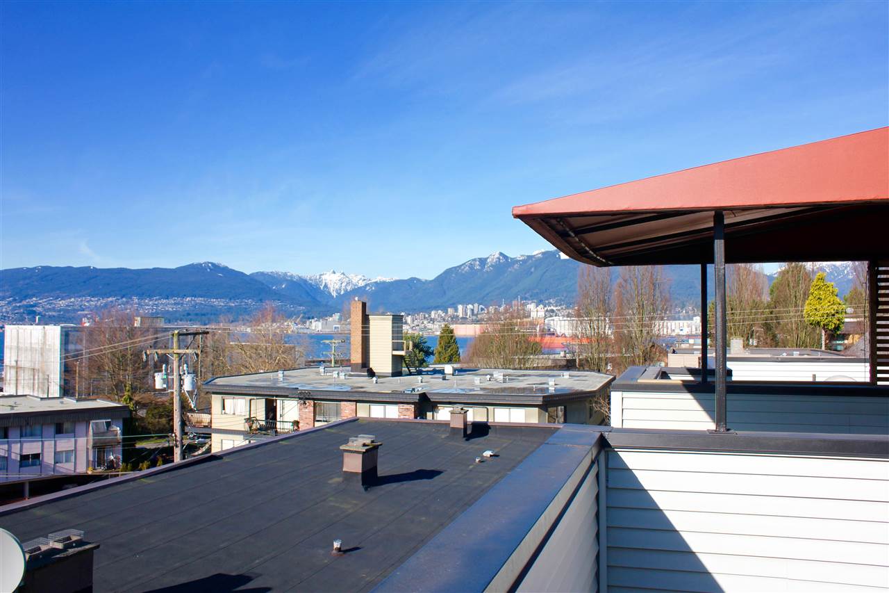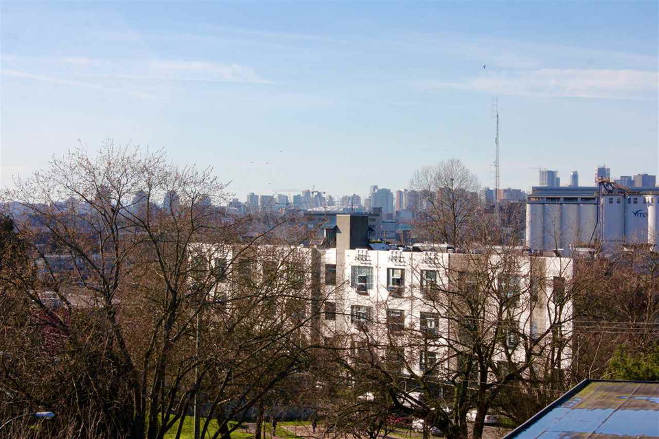 VIEW! DECK! LOFT! LOVE! This contemporary home has everything on your wish list. A top floor, south facing, extra large TWO bedroom & loft space that leads to your private roof deck with panoramic Burrard Inlet & North Shore Mountain views. 16′ vaulted ceilings, glass railings, ledgestone feature wall, an open kitchen with sleek butcher block counters & breakfast bar, updated bathroom & laminate floors throughout. Enjoy full size in-suite laundry. An entertainer’s dream with separate dining area, spacious living room & adjoining walk-out balcony. The “Emerson” is a very well maintained unique building with only 5 units. A newer roof, windows, balconies, and recently painted exterior. Welcome to Hastings East! Open House Sat. Feb 13th and Sun. Feb 14th 2-4pm