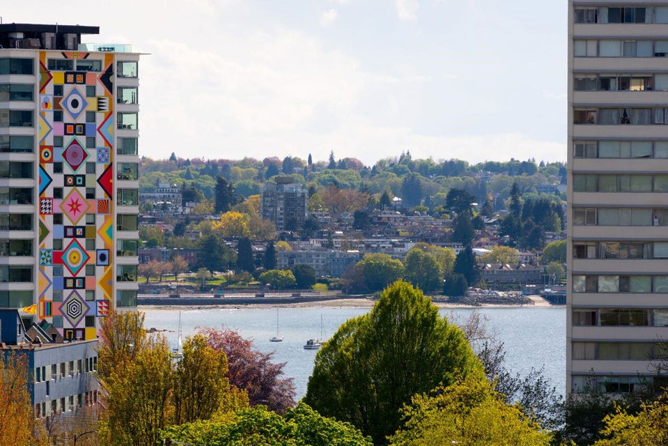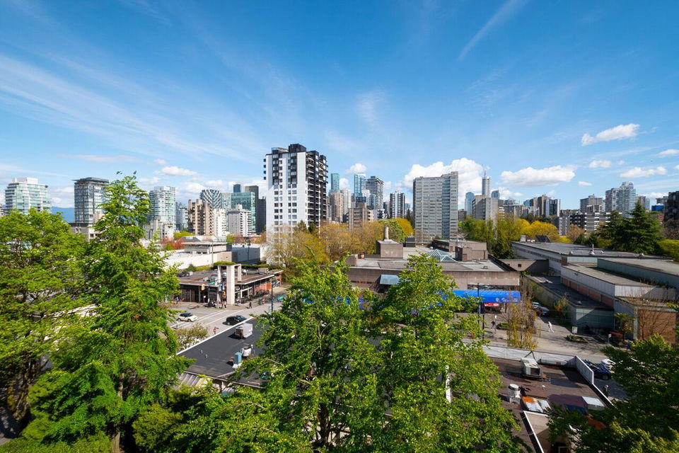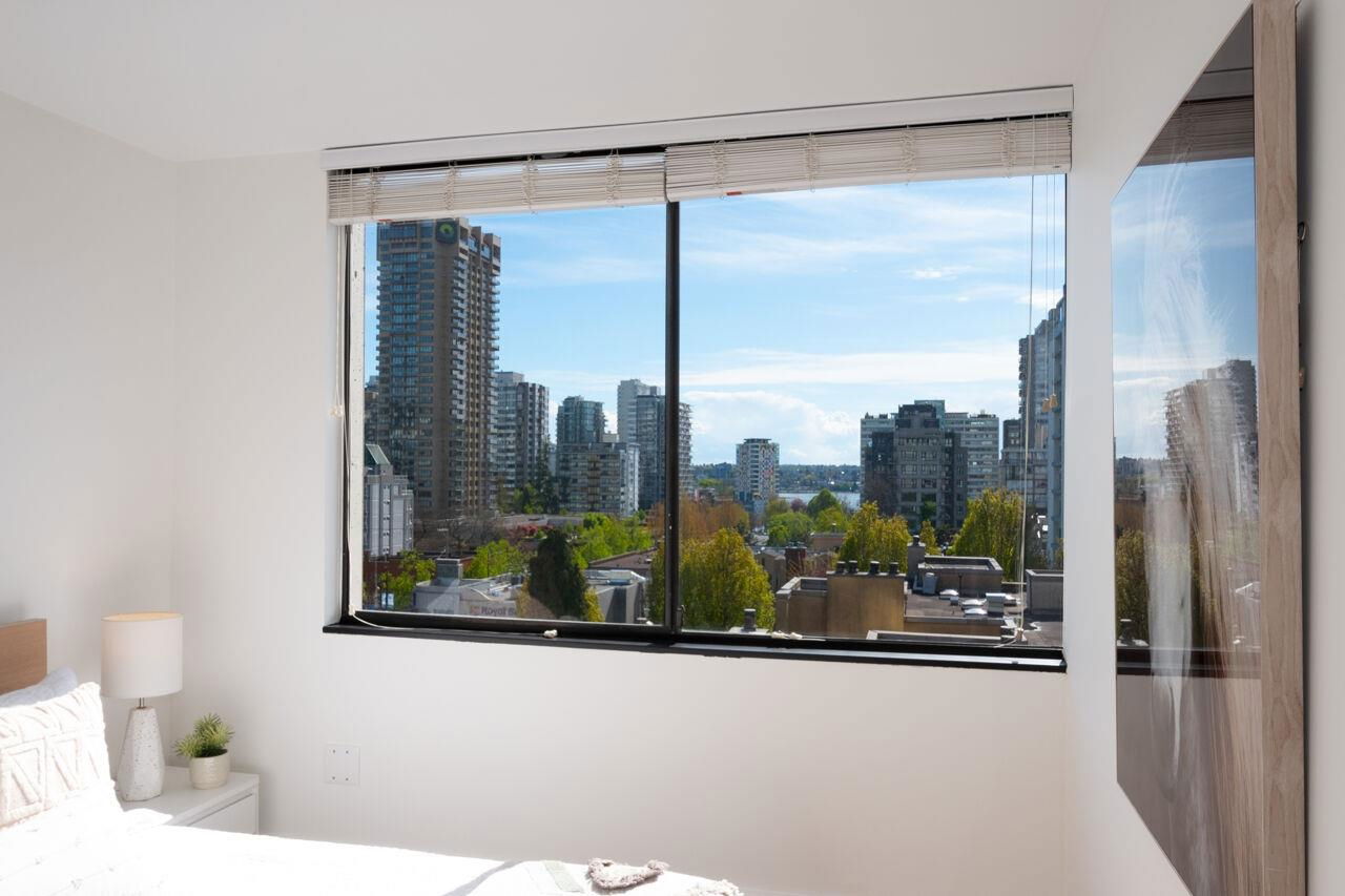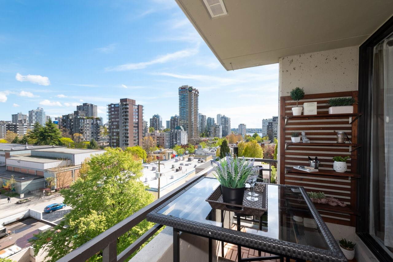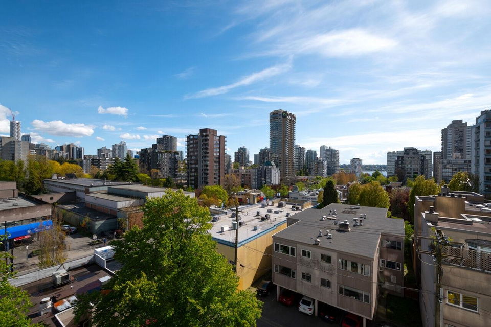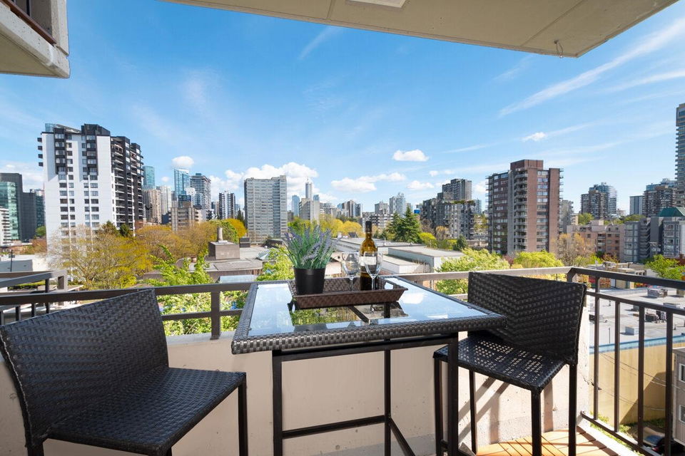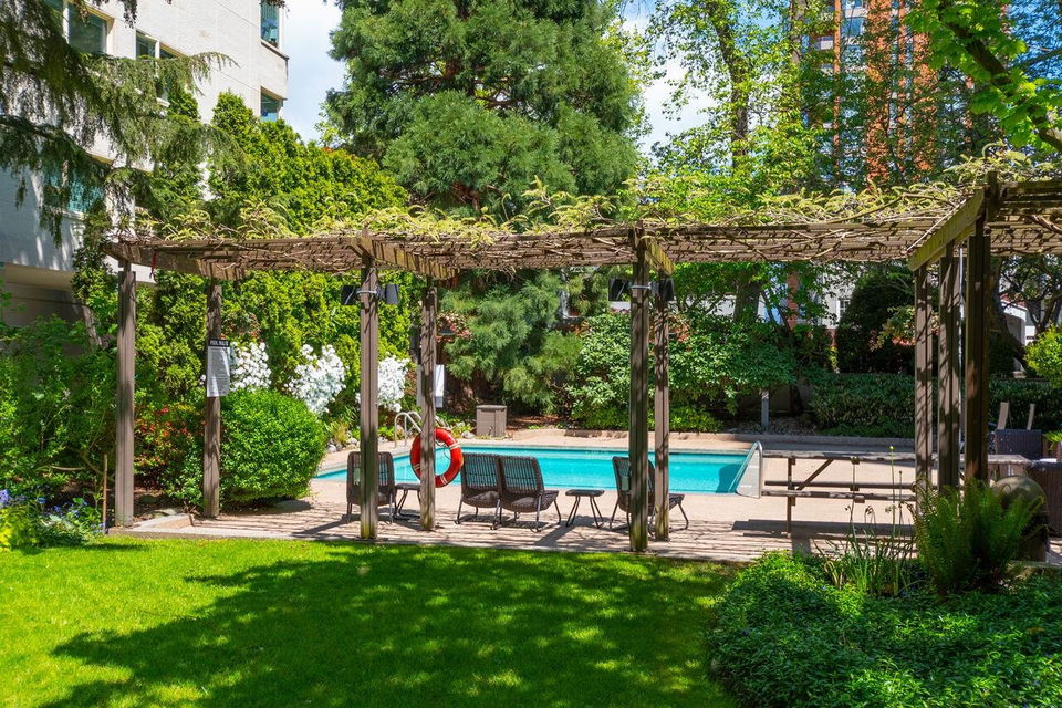 West of Denman reinforced concrete strata, located on large property with outdoor pool, manicured gardens offers fully renovated two bedroom SE corner. Enjoy great light & views to English Bay & city lights with glimpses of harbour & mountains from large, breezy open balcony! Offering spa inspired bath with huge walk in rainshower, modernized kitchen with stainless appliances & hood fan, built-in oven & cooktop, custom closets with organizers, oak floors & fresh paint. Smart, no waste space floorplan. Work is done so you can relax with guests, garden on your view balcony or soak up sun in resort like setting. Your city oasis is steps to shops, restaurants, community centre, library, sports & entertainment. Stroll seawall, play tennis in Stanley Park & walk everywhere