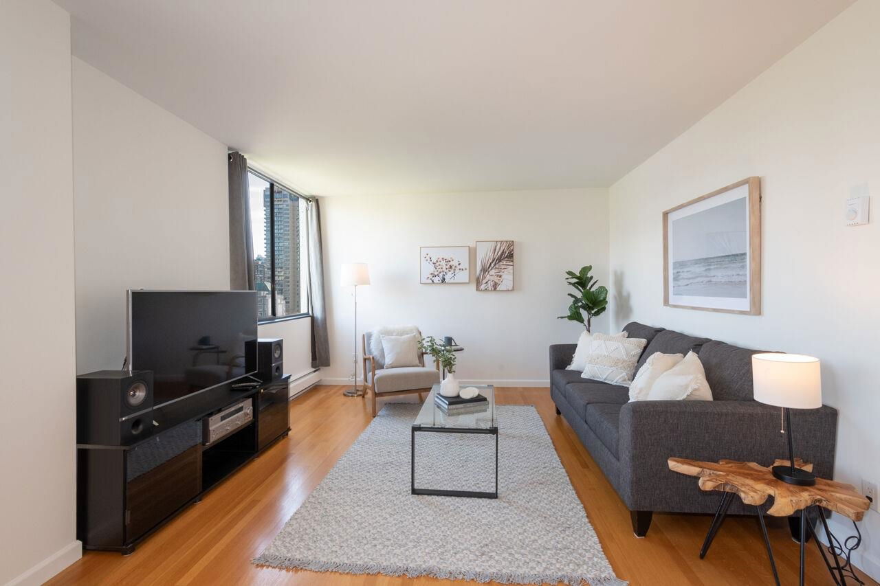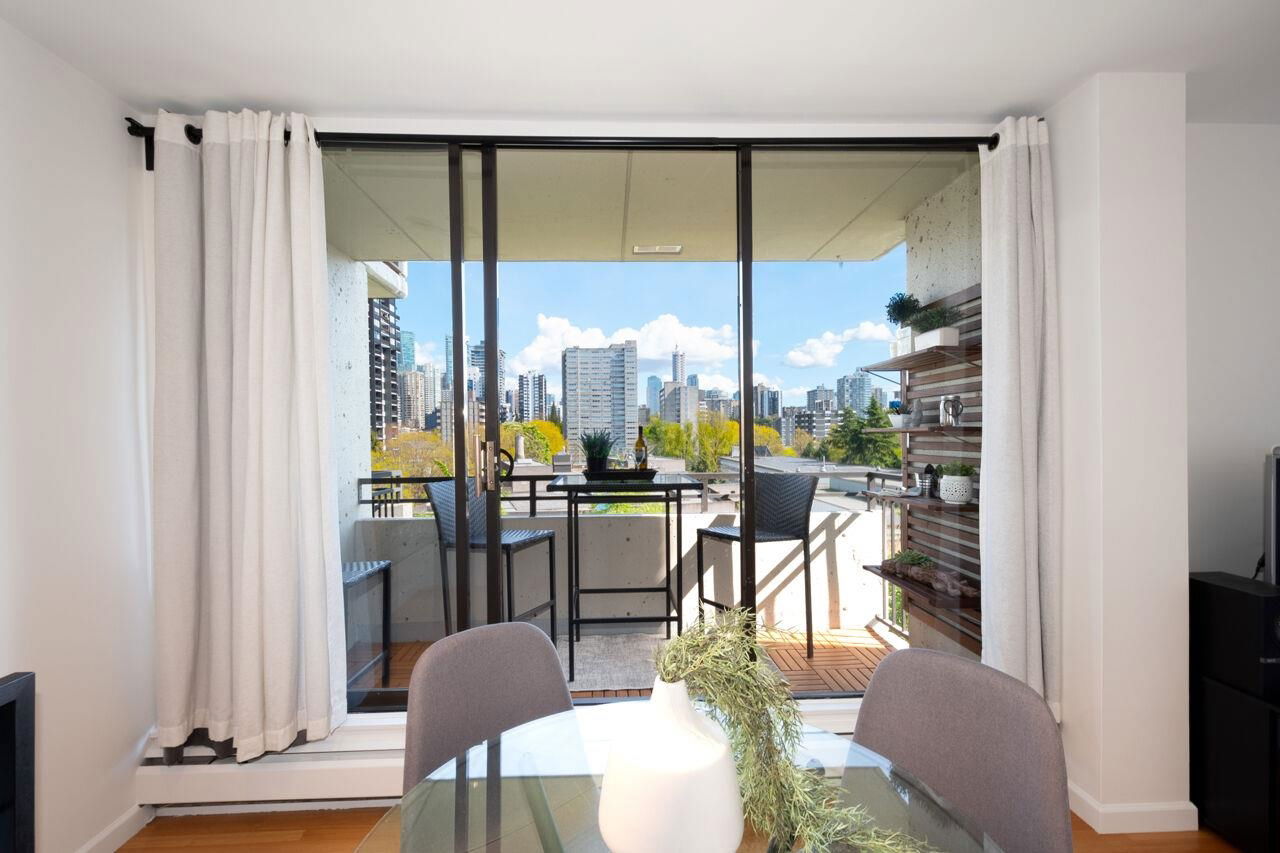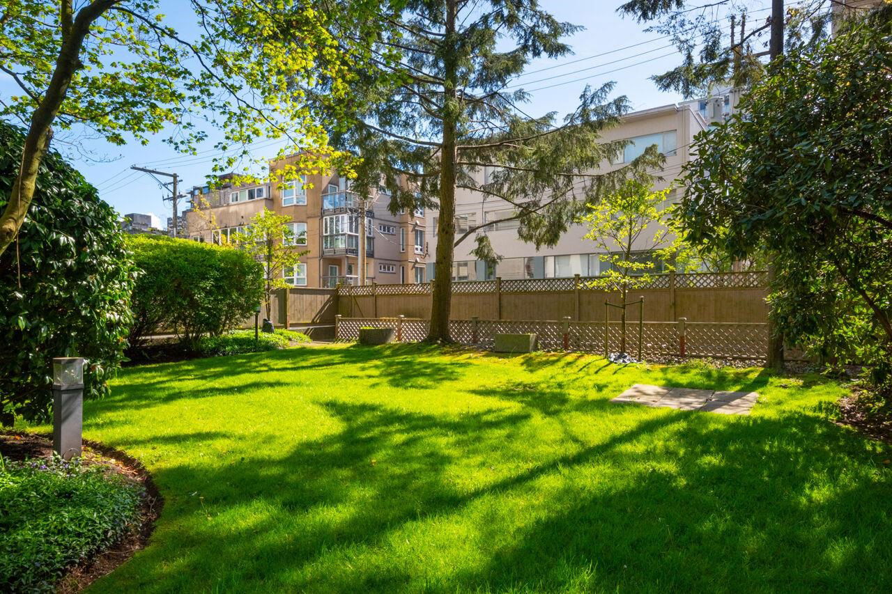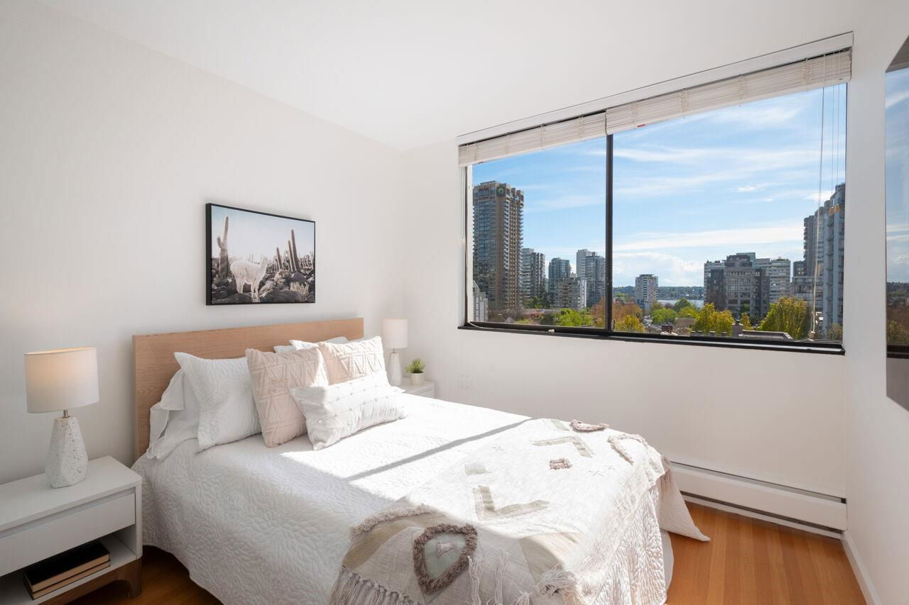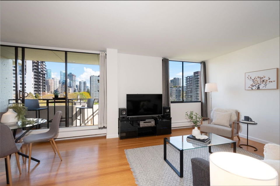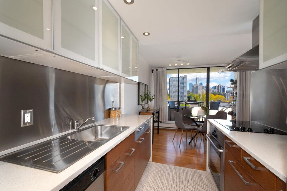 West of Denman reinforced concrete strata, located on large property with outdoor pool, manicured gardens offers fully renovated two bedroom SE corner. Enjoy great light & views to English Bay & city lights with glimpses of harbour & mountains from large, breezy open balcony! Offering spa inspired bath with huge walk in rainshower, modernized kitchen with stainless appliances & hood fan, built-in oven & cooktop, custom closets with organizers, oak floors & fresh paint. Smart, no waste space floorplan. Work is done so you can relax with guests, garden on your view balcony or soak up sun in resort like setting. Your city oasis is steps to shops, restaurants, community centre, library, sports & entertainment. Stroll seawall, play tennis in Stanley Park & walk everywhere